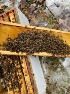 I had the privilege of speaking at the West Virginia Beekeeping Association’s Spring Conference this year and amongst the speakers was Dr. David Tarpy, who presented information about hive loss diagnosis. (Always good to learn something new, even when you are supposed to be the teacher!) He discussed that the assumed starving position (dead bees with butts hanging out of the comb) may really be due to fluctuating Winter temperatures disrupting consistent cluster formation and efficiency, which then, if followed by a quick extreme cold spell, bees will quickly move as deep as possible into the nearest cells for heat, not necessarily food. However, in extreme cold, they may not be able to generate enough heat, get close enough, for long enough to avoid freezing, as a primary cause of death. Colonies with this condition are commonly strong prior to the cold snap and have ample stores within the hive.
